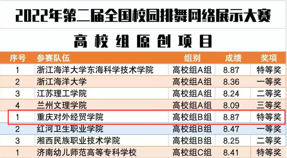 比赛通过网络展演,裁判集中评分环节后,学校代表队以8.87的高分获得原创项目高校B组特等奖,周碎平老师获得优秀教练员称号,学校获体育道德风尚奖。