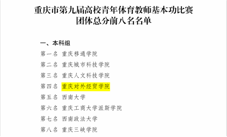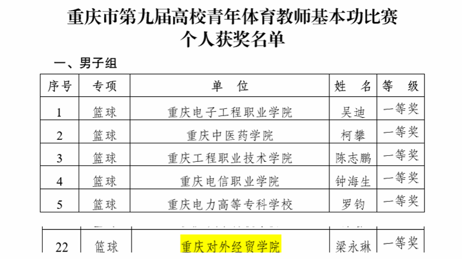 为加强体育团队队伍建设,特别是加快青年体育教师的成长与发展,2024年1月12日-14日,金沙js5588积极组织7名青年教师(5男2女)参加了重庆市第九届高校青年体育教师基本功比赛并获佳绩。