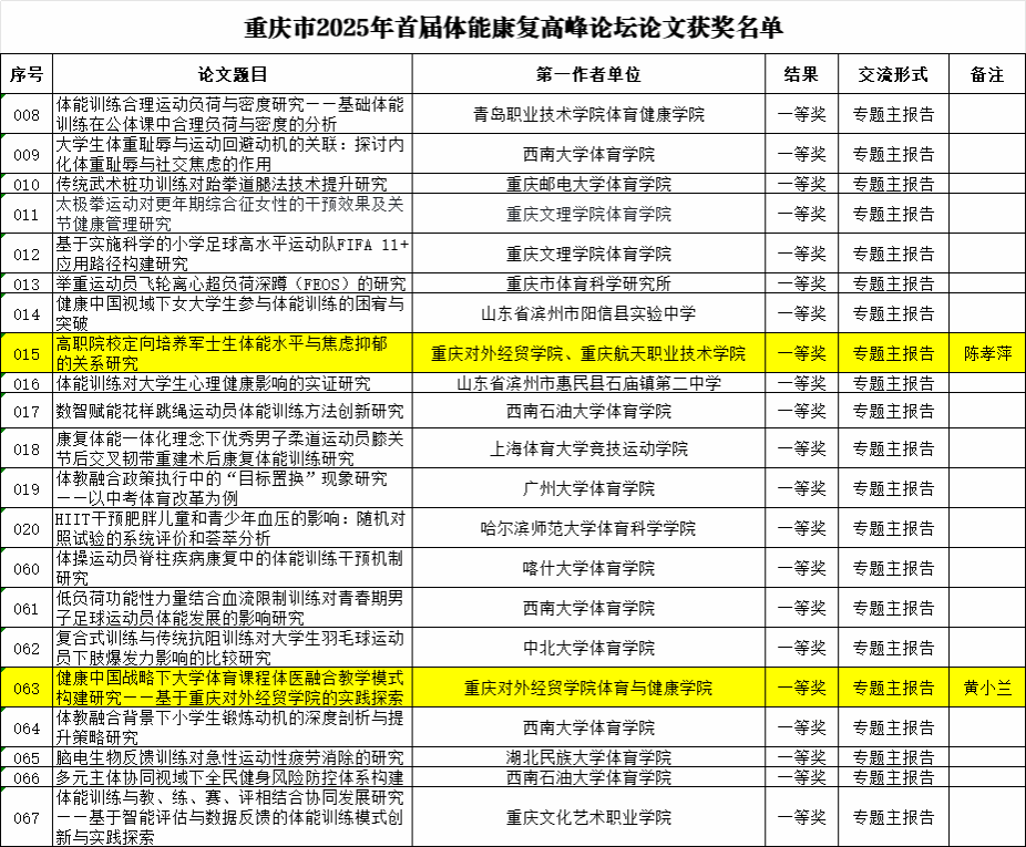近期由重庆市体科所主办,重庆文理学院承办的“重庆市首届体能康复高峰论坛”征文比赛中,学院陈孝萍、黄小兰两位老师在680名作者中脱颖而出,获得一等奖。